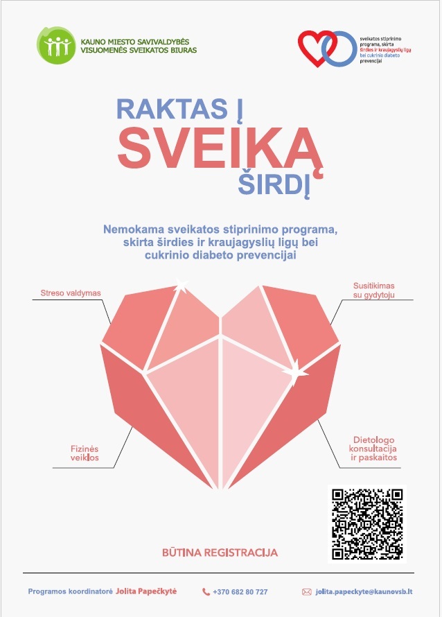 Kauno miesto savivaldybės visuomenės sveikatos biuras vykdo nemokamą sveikatos stiprinimo programą „Raktas į sveiką širdį“.